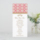 Cliquez sur le bouton customiser pour commencer à customiser cette carte de menu d'inspiration marocaine française élégante et magnifique avec un fuchsia rose chaud et doré géométrique design motif et des fleurs dorées huées or. Cette carte de menu haut de gamme et de luxe est parfaite pour toutes les soirées officielles, exotiques, marocaines, arabes ou aladdin, mariage, baby shower, douche à couple, fiançailles ou fête d'anniversaire. L'arrière peut être personnalisé avec votre nom d'événement. Oeuvre et design © Chrissy H. Studios, LLC. Tous droits réservés.