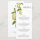 Ajoutez une touche spéciale à votre mariage avec ce menu personnalisé. La carte de menu mince présente des illustrations de citrons frais avec des citrons sur une branche et est prête à être personnalisée avec votre description des plats en lettrage brun foncé, et vos noms et date au verso.