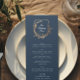 Menu classique marine or botanique motif crest Mariage