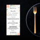 Carte menu fête d'anniversaire. Personnalisez et ajoutez un nom, un âge, une date et le menu. Un arrière - plan blanc chic, décoré de poussières de parties scintillant en faux or, d'or rose et de fleurs roses rousses, et de verdure d'eucalyptus. Lettres de couleur noire.