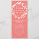 Long et maigre menu de table de mariage fait dans la couleur de corail élégante, avec un cercle pointillé par blanc, au dessus. Personnalisez tout le texte blanc pour adapter à votre menu de réception de mariage. Belle addition à votre réception de mariage.