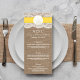 La collection de mariage de plage de sable jaune dollar est un design étonnant avec un bel arrière - plan rustique effet burlap avec une coupe romantique vintage effet dentelle blanche finie avec un étonnant dollar de sable et ruban jaune. Ces cartes de menu peuvent être personnalisées pour votre occasion spéciale et rendraient le modèle parfait pour les menus mariages, les menus de douche nuptiale, les menus de fiançailles, les menus de fête d'anniversaire et bien plus encore. *Veuillez noter que Zazzle ne vend que des produits imprimés, de sorte que cet article n'a pas de véritables boucles, dentelles, dollars de sable ou rubans.