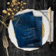 Un fond d'aquarelle dans des nuances allant du bleu royal au bleu marine est surmonté d'un abstrait de fines lignes dorées et d'effets lumineux scintillants pour créer les éléments de cette belle papeterie de mariage. La carte de 'Menu' de mariage présentée ici présente également une calligraphie élégante et une mise en page décentrée pour un attrait visuel. Ajoutez facilement vos propres initiales, date de mariage et sélections de menu en utilisant le modèle fourni. Recherchez l'ID867 pour voir d'autres éléments et choix de couleurs pour cet ensemble.