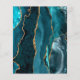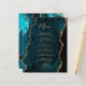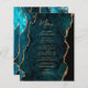 Ce menu de mariage moderne élégant présente une bordure d'agate aquarelle bleu sarcelle ornée de paillettes dorées fausses. Le texte personnalisable combine une écriture manuscrite dorée et des polices copperplate. Le verso présente un motif d'agate sarcelle et or assorti.