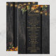 Modèle de menu de réception de mariage avec des éléments botaniques d'automne orange brûlé rustique et vert sur un fond en bois de grange brun foncé avec des guirlandes lumineuses. Idéal pour votre mariage champêtre élégant rustique d'automne en extérieur dans le jardin ou à la ferme.