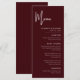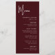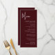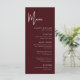 Le menu de mariage élégant et moderne couleur bordeaux est conçu pour élever votre expérience culinaire avec un style raffiné et une présentation soignée. La riche couleur bordeaux ajoute de la chaleur et de la sophistication à votre décoration de table, complétant instantanément les thèmes de mariage formels, modernes et romantiques. Une mise en page propre et contemporaine garantit que chaque plat est clairement affiché, permettant aux invités de profiter du menu d'un coup d'œil tout en appréciant son design élégant. Une typographie soigneusement sélectionnée et un espacement équilibré donnent au menu une sensation intemporelle qui se marie parfaitement avec la papeterie de mariage coordonnée. Conçu pour les couples qui se soucient de chaque détail, ce menu de mariage transforme votre liste de repas en une touche finale soignée qui améliore l'ambiance générale de votre célébration.