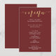 Ces cartes de menu typographiques bordeaux et or élégantes donneront le ton à une expérience culinaire raffinée. Le faux foil doré pour le mot "menu" se mariera à merveille avec de nombreuses couleurs de fond différentes si vous souhaitez personnaliser.