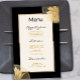 Un design élégant et moderne mettant en vedette des succulentes lumineuses en faux feuille d'or dans les coins opposés de ce menu de mariage. Un fond noir.
