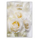 De belles roses blanches ornent le menu de mariage à mettre sur la table de chaque invité. Texte, police, taille et couleur totalement personnalisables comme vous le préférez.