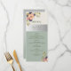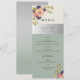 Simple, rustique, botanique, élégant menu de mariage vert sauge avec fleurs roses blush aquarelle et calligraphie moderne.