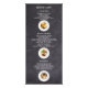 Avoir cette carte de menu alimentaire sur présentoir élèvera l'ambiance de la fête que vous prévoyez d'organiser, ou elle peut être utilisée comme un outil pour promouvoir les spécialités culinaires de votre restaurant. Son esthétique classique de tableau noir donne une atmosphère accueillante et faite maison qui donnera à vos invités ou clients envie d'explorer vos délicieuses offres et de laisser une bonne impression durable. La mise en page du design a une touche minimaliste tout en affichant un visuel engageant à travers ses éléments graphiques et textuels mis en avant, parfait pour présenter et commercialiser de manière professionnelle les spécialités du jour ou les plats signatures. Vous pouvez également personnaliser ceci en remplaçant les photos que vous souhaitez mettre en avant pour rendre cet outil promotionnel ou cet élément essentiel de fête plus captivant. Ajoutez un logo de restaurant au dos pour élargir largement l'identité de votre marque et rendre votre entreprise plus accessible en incluant les coordonnées, l'e-mail, le site web, l'emplacement et les