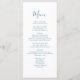 Complétez vos repas de fête avec notre menu de mariage élégant, un complément parfait à votre décor classique de réception. Avec une palette de couleurs minimaliste bleu et blanc, ce menu combine un script de calligraphie élégant et un style typographique élégant pour une touche d'élégance simpliste. La disposition des repas à trois plats assure une fonctionnalité pratique tandis que le monogramme de retour ajoute un détail personnalisé. Conçu dans un style simple et minimaliste, c’est un choix idéal pour des célébrations sophistiquées et intemporelles.