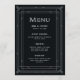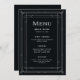 Ce menu mariage est séduisant et présente une touche moderne d'art déco classique. Un cadre géométrique blanc et orné orne un élégant arrière - plan noir onyx foncé pour un dîner vintage et spectaculaire.