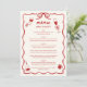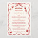Ajoutez une touche de charme à votre table mariage grâce à ce menu d'inspiration rétro illustré à la main, un délicieux mélange d'art unique et de design fantaisiste. Cette carte de menu comporte un cadre ondulé et un arc dessiné à la main en haut, captant la nostalgie de la papeterie vintage tout en la gardant fraîche et tendance. Avec des illustrations ludiques et griffées de gribouillis et du texte écrit à la main, chaque détail se sent façonné à la main, créant un souvenir mémorable pour vos invités qui apprécient le repas soigneusement préparé que vous avez prévu pour votre journée spéciale. Imprimé sur papier de haute qualité, le design distinctif du menu est à la fois visuellement attrayant et sophistiqué, ce qui en fait un bel ajout à tout thème mariage, du rustique au boho et d'inspiration vintage. Le style charmant, dessiné à la main et les gribouillis décontractés ajoutent un élément d'amusement sans sacrifier l'élégance. Idéal pour les couples à la recherche d'un menu qui reflète leur personnalité unique et leur style artistique, ce design séduira vos invités et les fera participer à la célébration. Parfait pour une réception de mariage pleine de charme et de personnalité, ce menu illustré à la main est la touche finale pour une expérience culinaire aussi soignée que belle. Que votre style mariage soit rétro, rustique ou délicieusement éclectique, ce menu apporte une touche artistique qui restera dans les mémoires et chérie.