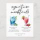 Cette carte chic signature plage mocktails propose une typographie noire simple au-dessus de 2 boissons balnéaires et leurs ingrédients pour votre fête côtière. Un délicieux lever de soleil hawaïen bleu et un dessin de fraise Daiquiri non alcoolisé ajoutent une touche cool à votre menu du bar. Complétez avec les noms du couple et la date de leur réception.