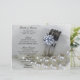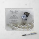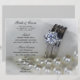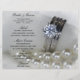 Das hübsche "Diamond Rings and Pearls Wedding Menu" mit den Details der Mahlzeit, die Sie bei Ihrem Hochzeitsessen oder Mittag servieren, wird durch das Hinzufügen von Salat oder Vorspeise, Vorspeise, Zweitgang und Dessert oder dritter Gang ergänzt. Personalisieren Sie es mit den Namen der Braut und des Bräutigams, dem Ort des Empfangs und dem Datum der Ehe. Dieses elegante Hochzeitsmenü verfügt über ein nahes Foto eines Diamant Verlobung Ringes und ein Set mit einer Hochzeitskapelle mit weißer Perlenhalskette.