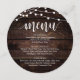 Cottage rustique moderne Bois Brown foncé, Lumières à cordes, Formes de Plaques rondes, Menu Dîner Mariage. Un menu de bar parfait pour votre grand jour. Vous pouvez modifier les couleurs de police du script et le contenu et les polices du menu pour répondre à vos besoins.