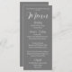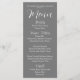 Carte de menu pour dîner en couleur gris foncé pour votre mariage, au style simple, avec un script blanc et stylisé, accompagné de vos informations personnalisées. Modifiez la carte de menu et remplacez le nom et la date du mariage ainsi que les éléments du menu qui seront servis à la réception de votre mariage. Sélectionnez votre style de carte de menu selon vos besoins.
