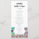 Dégustez vos invités avec ce menu de mariage à thème de dinosaures coloré avec l'amusante mariée T-Rex et le marié dans une prairie fleur sauvage préhistorique colorée. Facile à customiser avec les noms des mariés et mariés, la date du mariage et tous les détails du menu mariage dans le script de typographie moderne. Fun Tyrannosaurus Rex marié et groom dino et aquarelle illustrations florales dans les tons rose bleu violet jaune orangé et vert. Dino original unique oeuvre de l'artiste Catherine Sweetman