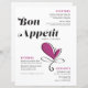 Ces dîners de style vintage de 8,5" x 11" mariages menus de feuilles de papier noir avec un titre stylisé, "Bon Appetit", en grandes lettres noires avec un accent de coeur magenta sur un arrière - plan d'albâtre. Le menu propose 2 entrées, 2 entrées et 2 desserts ainsi que les noms des couples mariages.