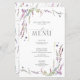 Créez le cadre parfait de la réception avec ce menu tendance de 5,5 po x 8,5 po avec de jolis et délicats fleurs sauvages branchés. Personnalisez vos détails accentués avec une belle calligraphie moderne lettrée à la main en noir doux. Parfait pour, mais pas limité à, ce mariage de jardin et de jardin. Fait partie d'un ensemble correspondant. Voir la collection complète ici : https://www.zazzle.com/collections/purple_lilac_lavender_wildflower_wedding-119347990909221303. Copyright Invitations élégants, tous droits réservés.