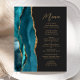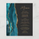 Le bord gauche de cet élégant menu mariage moderne présente une aquarelle bleue turquoise ornée d'une parties scintillant en faux or. Le texte personnalisable combine écriture manuscrite couleur or et polices sans serif sur un arrière - plan noir en ardoise foncée. Le design turquoise et or agate est répété à l'envers.
