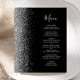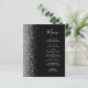 Le bord gauche de cet élégant menu mariage moderne présente une bordure de parties scintillant en faux argent. Le texte personnalisable combine écriture manuscrite gris argenté et polices cuivre sur un arrière - plan noir. L'envers présente un design noir et argent assorti.