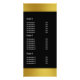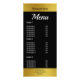 Avant : En haut, cette carte à crémaillère élégante présente un texte noir pour le nom du restaurant sur une fausse bande d'or. En-dessous, le texte blanc dit 'Menu'. Sous Menu, il y a du texte blanc pour les éléments et les prix de votre menu. La fausse bande d'or en bas contient du texte noir pour l'adresse et le numéro de téléphone. Retour : Il y a du texte blanc supplémentaire pour les articles de menu et les prix. Tout le texte peut être modifié ou supprimé. L'or est un rendu artistique (pas un film).