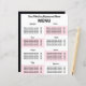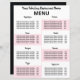 Vous aider, vous et vos clients, à rester en sécurité. Utilisez ce menu temporaire disponible. Ajoutez les options de menu et les informations sur le restaurant. Ajoutez une photo au verso si vous le souhaitez. Cela peut également être un dépliant pour vos clients si vous livrez à la maison. Gardez l'information sur l'option alimentaire courte. Le client peut emmener cette maison avec eux, donc il fonctionne comme un carte de visite aussi. C'est rose et blanc. Une partie de la réglementation pour la réouverture est des menus jetables, utilisez ce modèle pour adapter votre menu pour votre restaurant réouverture. Si vous avez besoin d'aide pour personnaliser ceci, contactez le concepteur., Pas de commande minimum.