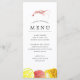 Menus de nourriture personnalisés sur le thème des crevettes pour votre prochaine fête d'ébullition de crevettes ou événement de fruits de mer. Il présente une illustration de style aquarelle d'une crevette. En dessous, il y a des espaces pour les informations de votre menu d'événement unique.