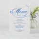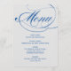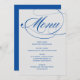 Les cartes de menu élégantes et formelles du mariage comprennent un script de calligraphie bleu roi ou cobalt avec une formulation de menu personnalisée qui peut être personnalisée. Couleur arrière - plan gris argenté.