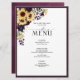 Créez le cadre parfait de la réception avec ce menu tendance de 6,5 x 8,75 pouces avec un bouquet de prune violet, de tournesols et de verdure botanique, et bordée de prune violette. Personnalisez vos détails accentués par une belle calligraphie à la main moderne. Parfait pour, mais pas limité à, ce mariage de jardin et de jardin. Partie d'une suite mariage que nous espérons que vous aimez autant que nous : https://www.zazzle.com/collections/elegant_sunflower_plum_purple_watercolor_script-119479724198769053 Copyright Anastasia Surridge pour Invitations élégants, tous droits réservés.