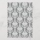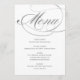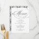 Les cartes de menu élégantes et formelles du mariage blanc comprennent un script de calligraphie gris-fusain foncé et un motif damassé au dos de la carte.
