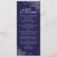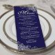 Ce beau menu ajoutera un peu de style à votre réception de mariage. Il présente un design magnifique avec des boucles et des tourbillons en faux feuille gris argenté ornés sur un arrière - plan bleu marine. Il y a de l'espace pour les noms du couple et la date du mariage, et le texte est entièrement personnalisable. Élégant, classe et glamour, ce menu ajoutera un air de sophistication et de grâce à votre célébration.