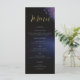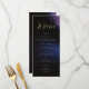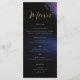 Quelques branches d'eucalyptus feuille, dessinées à la main dans un crayon de couleur et revêtues de teintes poussiéreuses et violettes foncées, confèrent une carte de menu mariage moderne, sophistiquée, élégante mais chic. L'arrière - plan noir et bleu foncé avec des touches de violet et des lumières illuminent le ciel de minuit. L'élégant script de calligraphie, dans la teinte d'or, rend ce design élégant noir et violet encore plus festif et élégant.