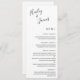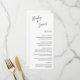 Menu mariage simple en noir et blanc avec vos noms dans un élégant script manuscrit en haut à gauche et vos options de menu en alignement droit en bas à droite. Le design minimaliste est agrémenté d'une touche romantique grâce au lettrage à la main chic.