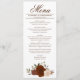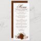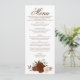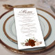 Ce beau menu ajoutera un peu de style à votre réception de mariage. Il présente un beau design boho chic floral avec un ensemble de roses d'aquarelle peints à la main dans les tons de rouille orange, de bois brûlé, de pêche au corail, ainsi que des sprigs d'eucalyptus feuilles et de végétation de jardin d'automne ou d'automne. Il y a de l'espace pour les noms du couple et la date du mariage, et le texte est entièrement personnalisable.