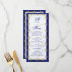 Frame your wedding menu with elegant metallic royal blue and gold jeweled filigree. White satin in the background adds to the luxury. Easily customize the coordinating blue text in classic fonts.