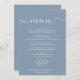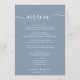 Elégant menu de réception de mariage bleu poussiéreux avec "menu" dans un script de calligraphie blanc chic avec des swashes, votre menu customisé dans une simple typographie blanche, vos prénoms unis par un coeur et votre date de réception.