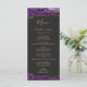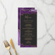 Ce menu mariage moderne et élégant présente des bordures de haut et de bas d'agate d'aquarelle violette parée de parties scintillant en faux or. Le texte apparaît dans une élégante écriture manuscrite de couleur or, des polices italique et cuivre sur un arrière - plan noir ardoise. La conception de l'agate est répétée à l'envers.