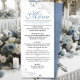 Ce beau menu ajoutera un peu de style à votre réception de mariage. Il présente une belle conception avec des boucles et des tourbillons en faux feuille gris argenté ornés sur un arrière - plan blanc classique, avec un texte bleu poussiéreux et un dos bleu foncé marbré. Il y a de l'espace pour les noms du couple et la date du mariage, et le texte est entièrement personnalisable. Élégant, classe et glamour, ce menu ajoutera un air de sophistication et de grâce à votre célébration.