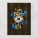 Composition de l'horloge ronde steampunk avec cadran romain noir, décoré avec des engrenages or et laiton, papillons Morpho bleu et lentilles endommagées sur arrière - plan rayé brun. Style Steampunk.