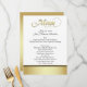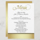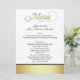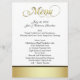 Menus élégants de table de réception de mariage faits dans le blanc, avec une bande d'or et de noir, sur la bâche avant et goldtone inférieure le dos du menu. Le menu en texte graphique de fantaisie goldtone de manuscrit, décore le dessus du menu. Tout le reste du texte noir est prêt à personnaliser pour votre réception de mariage. Produits assortis de mariage disponibles.