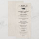 Ce menu mariage rustique et branché présente une ambiance moderne avec son élégant texte noir, sa silhouette de vache et sa typographie sur un arrière - plan à l'aspect bois blanc.