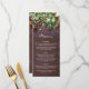 Cartes de menu de fête de Noël rustique avec un fond en bois sombre, branches d'arbre de Noël festives, décorations d'arbre rouges et dorées et guirlande de lumières scintillantes.