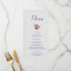 Ce menu de réception de mariage est composé d'un joli menu de réception de mariage à fleurs violettes utilisant ce magnifique design aquarellé. Avec "Menu" en haut avec une police de caractère violet cursive, toutes vos informations sont imprimées en police violet lisible sur un arrière - plan violet clair. Customisez comme vous le souhaitez.