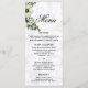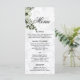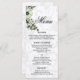 Vos invités peuvent dîner dans le style à votre réception de mariage avec ce beau menu de mariages floraux boho vert. Il a un design élégant d'un motif doux gris et blanc damassé dans l'arrière - plan avec un bel arrangement floral vert avec baies et fleurs au coin supérieur gauche.