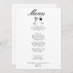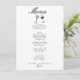 Un menu vintage rétro moderne, noir et crème mariage pour le dîner. Ce qui présente un design modèle chic de la typographie arrière - plan blanche et manuscrite noire. Avec du vin tiré à la main et des verres à champagne sur le devant. Et du gâteau tiré à la main sur le dos. Un Parfait et assorti à toute la suite.