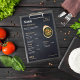 Menü im Restaurant | Modernes Schwarz-Foto-Menü, einfaches, benutzerdefiniertes Logo und 4-Foto-Menüvorlage im modernen minimalistischen Stil auf schwarzem Hintergrund.