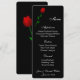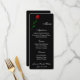 Menü-Karte auf schwarzem Grundpapier mit abgerundeten Ecken und mit einem Single-rote Rose-Druck. Im unteren Teil befinden sich die Namen der Braut und der Bräutigam und das Hochzeitstag zum Gedenken an Ihre Veranstaltung. Skript und Standardtext in Weiß. Passen Sie Ihre Namen und Menüpunkte an, indem Sie auf die Schaltfläche Anpassen klicken, suchen Sie nach rechts und finden Sie geeignete Felder, um Ihre Informationen zu ändern. Wir wünschen Ihnen viel Spaß beim Hochzeitsfest.
